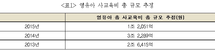 영유아 사교육비 총 규모는 2014년에 3조 2천억 대까지 폭증했다가 2015년 1조 2,051억 원으로 많이 줄어들었습니다. 무려 2조 238억, 무려 63%가 줄어든 것입니다.