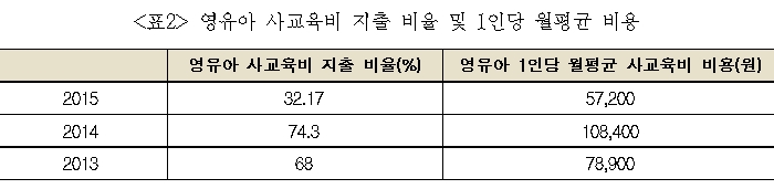 앞으로 육아정책연구소에서 발표하는 영유아 사교육비 통계는 활용하기 어렵습니다. 기준이나 비용 모두 타당성을 잃었기 때문입니다. 다행히 교육부는 지난 1월 28일 발표한 ‘2016 교육부 업무계획’에서 영유아 사교육비를 직접 조사하겠다고 밝혔습니다.