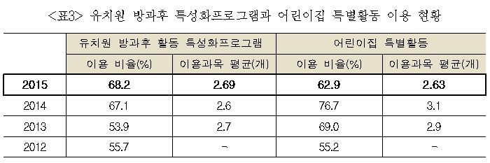 이 정의를 따르면 유치원과 어린이집에서 제공하는 방과후 특성화 활동과 특별활동이 사교육비 범주에서 제외됩니다. 2015년 기준, 유치원·어린이집에 다니는 아동의 60~70%가 특별활동(특성화프로그램)을 이용하고 있을 정도로 특별활동은 영유아 사교육비에 미치는 영향이 큰 항목입니다(표3 참조). 게다가 유치원·어린이집 특별활동은 부모 선택에 의해 비용이 지출되는 이른바 수익자 부담 프로그램이며, 프로그램 진행 주체 또한 민간교육업체가 대부분을 이루고 있습니다. 아무리 프로그램 운영 장소가 공적인 성격을 가진 유치원·어린이집이라 하더라도 특별활동을 사교육비 범주에서 제외한 것은 영유아 사교육비 규모를 축소하기 위한 편법이 아닌지 의심케 합니다.