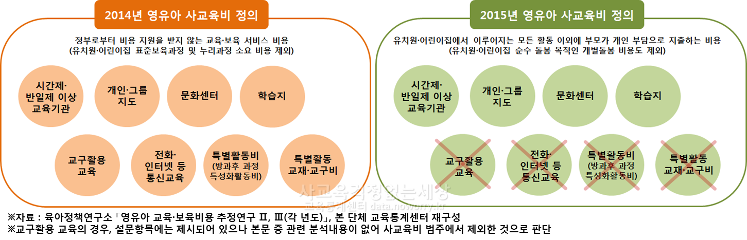 이번 연구는 2014년까지의 연구와는 ‘영유아 사교육’에 대한 정의를 달리하고 있었습니다. 2014년까지 연구에서 ‘영유아 사교육비’의 범위는 “정부로부터 비용 지원을 받지 않는 교육·보육 서비스 비용”이었던 반면, 2015년 사교육비 정의는 “영유아의 교육과 보육을 제공하는 공적인 성격을 가진 유치원과 어린이집에서 이루어지는 모든 교육·보육 활동 이외에 부모가 영유아의 교육·보육을 위한 목적으로 순전히 개인 부담으로 지출하는 비용”으로 축소 한정했습니다.