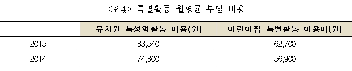 앞에서도 언급한 바와 같이 유치원·어린이집 특별활동의 이용률은 결코 무시할 수준이 아닙니다. 특별활동의 월평균 부담 비용 또한 매해 증가하고 있는 추세입니다(표4 참조). 보고서에 따르면 유치원은 2014년보다 8,740원, 어린이집은 5,800원이 증가한 것으로 나타났습니다.  특별활동은 비용부담 측면뿐 아니라 프로그램 이용 현황에서도 문제점을 가지고 있습니다. 유치원 방과후 특성화 활동 이용 현황을 살펴보면 영어가 74.9%로 가장 많았으며 어린이집도 영어가 70.5%로 가장 많았습니다. 이는 국가 교육·보육과정인 누리과정에서 다루어지지 않는 내용으로 프로그램 성격으로 판단할 때도 사교육의 성격이 뚜렷하게 나타나고 있는 부분입니다.