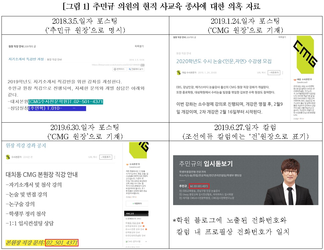 더욱이 추 의원의 경우, 사교육 업계에 ‘전직’ 종사자인지 ‘현직’ 종사자인지조차 의심스러운 정황까지 발견되었습니다. 대치동CMG수시전문학원 블로그에는 올해에도 추 의원의 이니셜과 일치하는 강좌 홍보가 버젓이 게시되어 있습니다. 도의원 당선 이후에는 원장의 실명을 노출하지 않은 채 이니셜 표기를 하고 있지만, 우측에 표기된 이력과 당선 이전 ‘추민규 원장’이라고 명시한 것으로 보아 도의원 신분으로 올해까지도 사교육 현장에서 강의를 겸직해온 것으로 보입니다. 만약 이것이 사실이라면 추 의원은 현직 학원업계 관계자로서 사교육 업계의 이해 당사자이므로 공명한 도정 수행이 사실상 어려운 것은 자명한 사실입니다. 이는 단순히 도의적 책임을 넘어서 지방자치법 제35조에서 금지하고 있는 ‘지방의회의원은 소관 상임위원회의 직무와 관련된 영리행위’를 범한 것이므로 의원으로서 심각한 부적격 사유가 될 것입니다.
