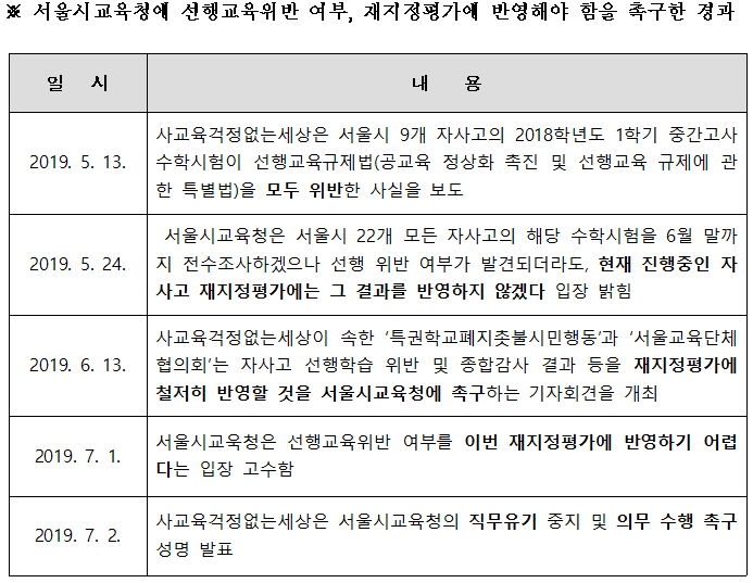 ■ 서울시 교육청의 선행교육위반 조사 결과, 재지정 평가 반영 거부 입장에 대한 비판 논평 (2019. 7. 2)