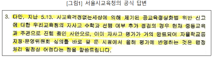 서울시 교육청, 선행교육위반 조사 결과를 재지정 평가에 반영하기를 거부한다고 알려왔으나 이는 납득하기 어려운 결정입니다.
