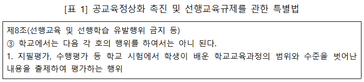 학교가 주관하는 정규 시험에서 해당 학년의 교육과정의 수준과 범위를 넘어서 출제하는 행위는 공교육정상화 촉진 및 선행교육규제를 위한 특별법(이하 선행교육규제법) 제8조 제3항 제1호에서 명백히 금지하고 있는 사안입니다. 시험을 포함하여 해당 교육과정을 바르게 운영하였는지 여부는 선행교육규제법 뿐만 아니라 초중등교육법 시행령 제91조의3 제4항 제3호에 의거, 자사고 지정을 바로 취소할 수 있는 핵심 기준이기도 합니다. 실제로 이번 평가 지표에서 ‘선행학습 방지 노력’ 항목은 지정 목적에 맞는 자사고 교육과정운영을 위해 강화된 부분입니다. 「2019년 서울시교육청 자사고 재지정평가 계획」을 보면 자사고의 선행 학습 실시가 판명될 경우, ‘자율학교 등 지정·운영위원회’에 해당 사실을 통보하고 0점 처리한다라고 명시하여 그 중요성을 그 어떤 지표보다 강조하고 있습니다.