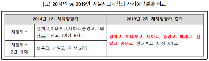 특히 이번에 재지정 취소된 8개 학교 중 7개교는 지난 2014년 1기 재지정평가에서도 이미 서울교육청으로부터 ‘지정취소’ 또는 ‘지정취소 2년 유예’라는 기준미달의 성적표를 받아들었던 학교들 입니다. 비록 당시 박근혜 정부 교육부에 의해 최종적으로는 자사고의 지위를 이어왔지만, 오늘의 결과는 이들 학교가 지난 10년간 꾸준히 자사고로서의 지정 목적을 달성하지 못했음을 입증하는 것이고 재지정 취소 결정에 대해 변명의 여지가 없는 상황이라 할 것입니다.