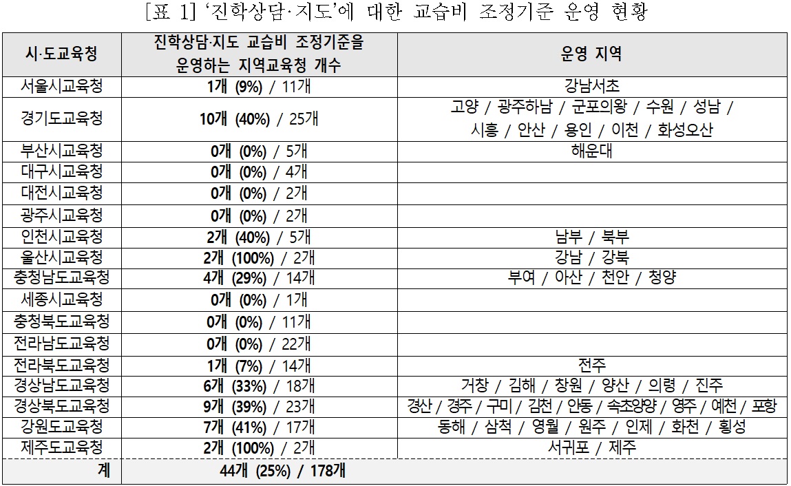 또한 전국 178개 지역교육청 가운데 ‘진학지도’ 교습과정에 대한 교습비 조정기준이 마련되어 있는 곳은 전체의 25%(44개)에 불과합니다. 진학지도는 컨설팅 전문학원뿐만이 아니라 일반교과학원에서도 교과교습에 겸하여 제공되는 경우가 많아 요즘과 같은 입시철에 학원 업계의 중요한 수입원이라 할 수 있습니다. 그럼에도 무려 134개 시·도교육청에서 보통교과(단과,종합) 교습과정과는 달리, ‘진학지도’ 교습비 조정기준 액수가 별도로 제시되지 않아 진학지도 학원들의 과도한 교습비 등록을 단속할 기준조차 마련되어 있지 않습니다.