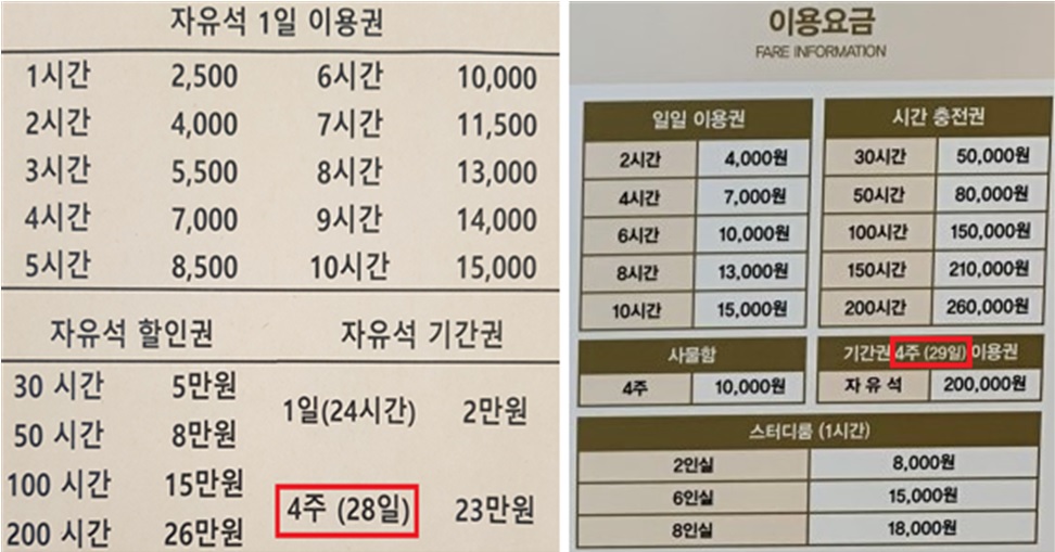 특이한 점은 기간권의 이용 일자가 1달(30일)이 아닌 4주(28일 또는 29일)로 되어 있었습니다. 통상 ‘1달(30일)’ 단위로 되어있는 독서실과 다른 점입니다. 1달 단위면 매월 정해진 일자마다 결제하면 될텐데, 4주 단위면 장기간 이용하는 소비자 입장에서는 결제일이 헷갈릴 수도 있습니다. 그럼에도 결제 단위를 이렇게 해놓은 이유는 학원법의 적용을 피하기 위해서로 보입니다. 학원법상 ‘30일 이상’ 학습장소로 제공되는 시설은 독서실로 등록해야 하니 스터디카페들은 30일 미만의 요금제까지만 만들어 학원법 적용을 피하려는 꼼수를 쓴 것입니다. ■ 학원법상 환불 규정 적용 안 받아 소비자 피해 우려돼 보다 더 심각한 소비자 피해는 바로 환불 문제입니다. 사교육걱정없는세상도 한 시민으로부터 스터디카페 4주권을 결제하고서 취업이 되어서 당일에 환불을 요청했더니 거부를 당했다며 구제 절차에 대한 문의를 받은바 있습니다. |
