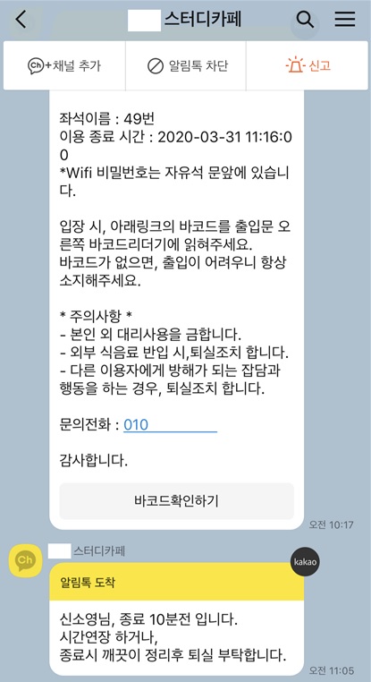 | 스터디카페 출입문 목전에는 CCTV 아래 사물함과 키오스크 기계가 있었습니다. 이곳에서 먼저 결제를 해야 스터디카페로 입장할 수 있는 무인 운영 방식인 것입니다. 개인정보(이름,전화번호)를 입력하고 결제한 다음, 핸드폰으로 전송되는 바코드를 태그하면 출입문이 열리는 구조였습니다. 한 스터디카페는 개인정보에 부모님 전화번호를 선택적으로 입력하게 하기도 했습니다. 입력자에 한해 스터디카페 입퇴장 정보를 학부모에게 문자로 전송하기 위함입니다. 스터디카페에 학원의 출석체크 기능이 접목되어 있음을 확인할 수 있었습니다. |