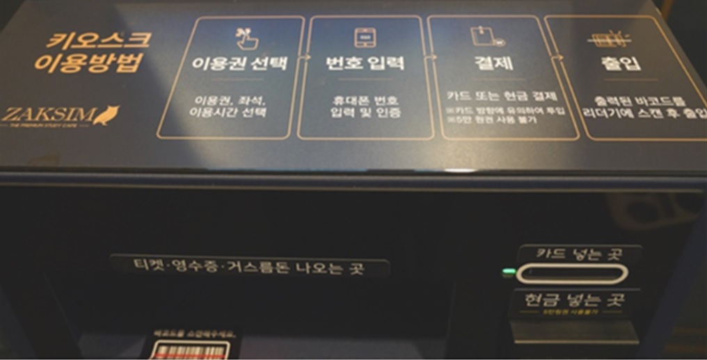 그러나 스터디카페는 학원법의 대상이 아니라 이러한 지하 입지가 현행법상 규제되지 않고 있는 것입니다. 요즘 같은 코로나 국면에서는 감염 예방을 위해 잦은 실내 환기도 중요한데, 지하 스터디카페는 그 점에서도 취약할 수밖에 없습니다. ■ 키오스크, CCTV로 완전한 무인운영 방식 |