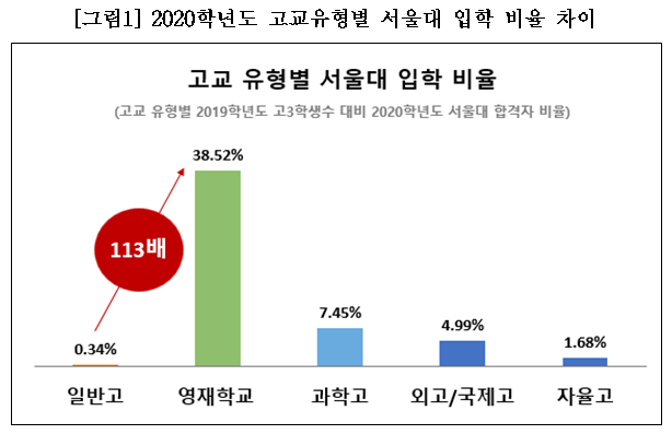 ▲ 그 결과 고교유형별 학생 수 대비 서울대 신입생 수 비율을 내면 일반고(0.34%)에 비해 영재학교(38.52%)는 약 113배, 과학고(7.45%) 약 22배, 외고/국제고(4.99%) 약 15배, 자율고(1.50%) 5배가 차이남.