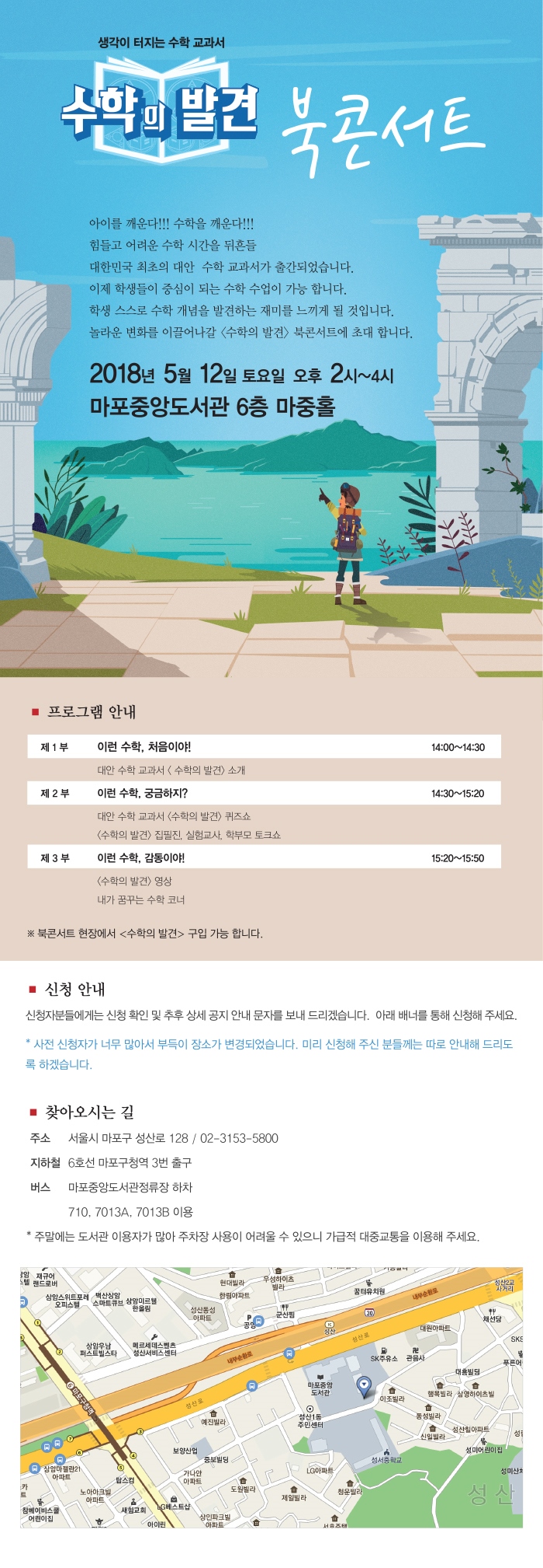 《수학의 발견》은 4월 23일에 출간된 후 출간 기념으로 5월 12일에 북 콘서트를 마련하고 참석 신청을 받았는데요. 예상했던 150명을 훌쩍 뛰어 넘어 벌써 3배에 이르는 400명 가까이 신청을 했답니다. 출판사 측에서도 전례가 없는 일이라 깜짝 놀라고 있습니다. 고심하다가 장소에 맞추어 참석 인원을 통제할 것이 아니라, 오시는 분들을 충분히 수용하자고 결정하였습니다. 그래서 긴급히 장소를 마포 중앙도서관 6층 마중홀로 바꾸었습니다.