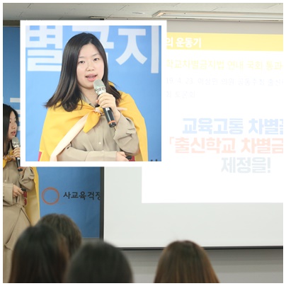 이어 사교육걱정 홍민정 상임변호사의 출신학교 차별금지법 제정 운동 경과 및 향후 계획 발표가 이어졌습니다.