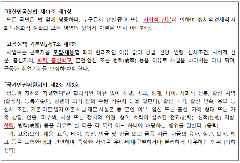 출신학교로 불합리하게 차별하는 것은 위헌적이고 위법적이며 반인권적인 처사입니다. 아래 헌법과 고용정책기본법, 국가인권위원회법은 출신학교로 인한 차별을 금지하고 있습니다.