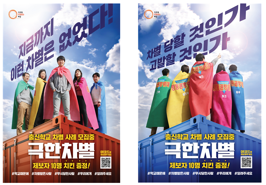 ▲ 사교육걱정없는세상은 출신학교 차별로부터 국민들을 구하기 위해 ‘평등권을 수호하는 방위대’(이하 평등권 방위대)를 조직하여 9해줘(9개) 프로젝트를 진행하고 있음. ▲ ‘지금까지 이런 차별은 없었다’, ‘차별 당할 것인가, 고발할 것인가’ 9해줘 프로젝트 3탄은 포스터 제작하여 평등권 방위대의 정체를 전국 방방곡곡에 알리고, 출신학교 차별로 고통받은 이들의 사례를 모집하는 것임. ▲ 사례제보는 4차 산업혁명 시대를 선도하는 방위대 스타일답게 △‘포스터의 QR코드’를 찍거나 △‘본 보도자료 하단의 배너’를 클릭하고 작성하면 됨. ▲ 작으나마 위로가 되고자 제보자 10명에게는 치킨을 증정하고자 함. ▲또한 평등권 방위대의 ‘극한차별 사례 모집 포스터 배포’에 동참하고 싶다면 하단 배너를 통해 신청하길 바람. ▲ 출신학교로 불합리하게 차별하는 것은 위헌적이고 위법적이며 반인권적인 처사임. ▲ 평등권 방위대는 이러한 차별이 시정될 수 있도록 모아진 사례를 출신학교 차별금지법 제정 운동에 동력으로 사용하며, 이러한 차별이 정의의 이름으로 시정될 수 있도록 노력할 것임.