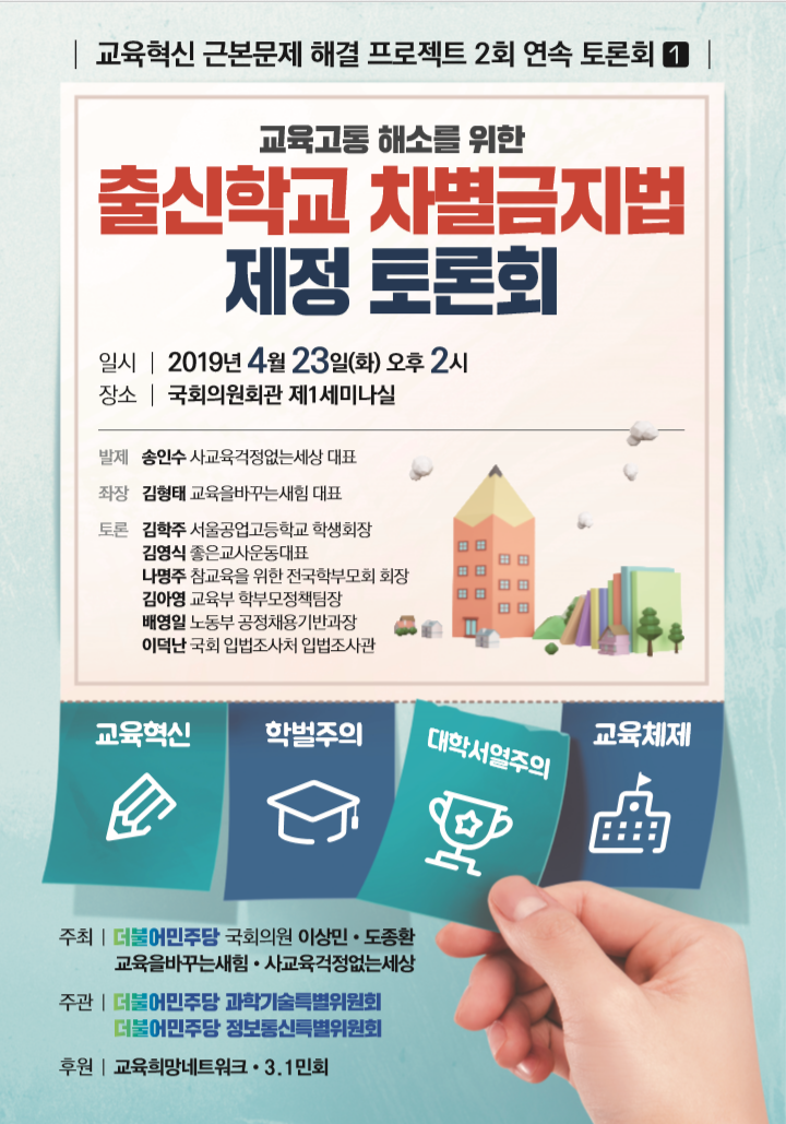 이런 지지부진한 상황에서 이상민 더불어민주당 국회의원이 최근 이 법률안의 필요성에 깊이 공감하고 이 법률이 20대 국회가 끝나기 전에 제정되도록 힘쓰자고 나서면서 다시 출신학교 차별금지법 제정 운동에 힘이 실리게 된 것입니다. 4선 의원인 이상민 의원은 저희 단체가 2012년부터 운동으로 추진하였던 선행교육규제법을 발의하고 2014년에 제정되도록 힘썼던 장본인입니다. 저희와 이미 선행교육규제법 제정을 함께 추진하시면서 국민의 사교육 고통을 누구보다 인지하고 계심으로 이번 출신학교 차별금지법 제정의 필요성과 의지가 매우 높아, 올 6월 통과를 목표로 가보자고 의욕을 보이고 계십니다. 저희로서는 천재일우의 기회라 하지 않을 수 없습니다. 아무리 시민단체와 민간 영역에서 힘을 써도 결국 법률 제정은 국회에서 의원이 발 벗고 나서지 않으면 안 되는 것을 감안하면 다음 주 국회의 토론회는 매우 중요하다 할 것입니다. 이번 국회 토론회에서는 저희 단체가 그동안 축적해 온 채용에서의 출신학교 차별 실상과 국민의 차별 체감 의식, 그로 인한 법안의 필요성과 구체적인 법률 시안까지 제시하는 발제를 담당하고, 전문가들과 시민들, 관련 부처인 교육부, 노동부, 국회 입법 조사처까지 망라해서 참석해 논의하는 자리입니다.