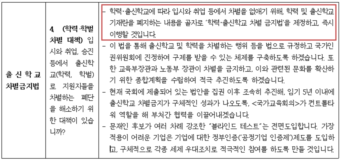 2. 문재인 정부가 추진하는 블라인드 채용은 공공부문에만 그 영향이 미칠 뿐, 민간 영역과 입시, 임금・승진 등 고용 전 영역에서의 출신학교 차별은 해소할 수 없습니다. 이는 우리 단체 100인 평가단 컨퍼런스에서의 공식적 약속과도 다르고, 공식공약집에 언급한 ‘입시와 고용에서의 학력・학벌 차별 관행 철폐’와도 거리가 멉니다. 더불어민주당은 입시와 고용 전 영역에서의 ‘학력・학벌 차별금지법 제정’ 약속을 반드시 지키십시오.