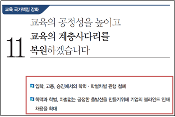 이어 19대 대선 당시 더불어민주당은 공식 공약집에서 교육의 공정성을 높이고 교육의 계층사다리를 복원하기 위해서 입학, 고용, 승진에서의 학력·학벌차별 관행을 철폐하겠다는 국민의과의 약속을 명시하기에 이르렀습니다.