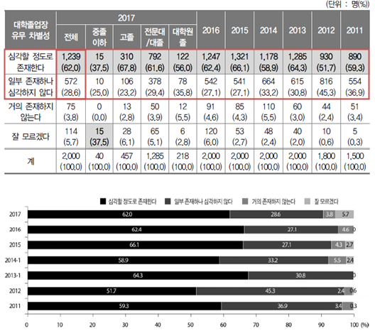 [그림 7] 대학졸업장 유무 차별성 (2011-2017)  출처: 한국교육개발원, 교육여론조사, 2017년
