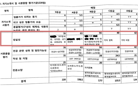 [그림 9] 2014년 한양대 로스쿨 서류종합 평가기준  출처: 한겨레신문, 로스쿨 ‘대학 카스트제’ 내부문건 공개합니다, 2016.6.3.