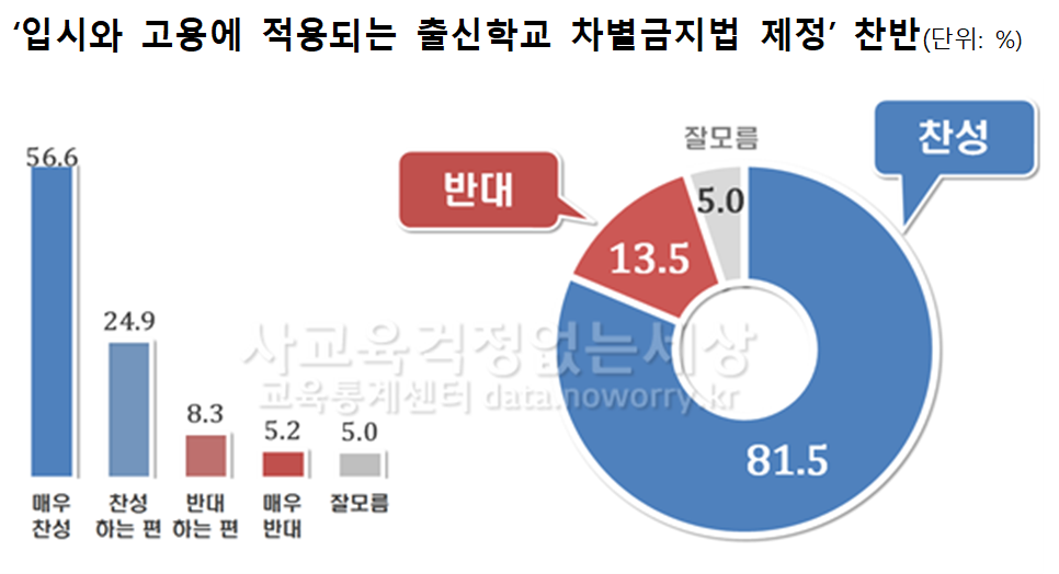사교육걱정은 2017년 11월 여론조사 전문기관 리얼미터에 의뢰하여 전국 만 19세 이상 성인남녀 1,008명을 대상으로 출신학교 차별금지법 제정에 대해 설문조사를 진행하였습니다. 조사 결과 국민들은 81.5%의 압도적인 수치로 입시와 고용에서 학력과 출신학교 차별을 막는 출신학교 차별금지법을 제정을 원하고 있습니다.