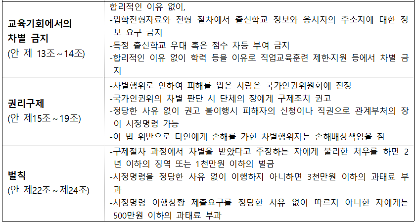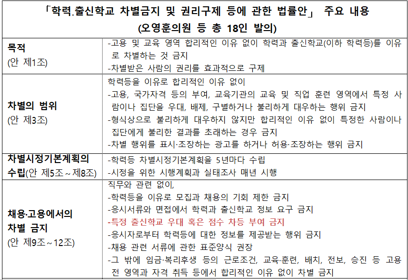 현재 20대 국회 교문위 법안소위에 계류 중인 출신학교 차별금지법(「학력․출신학교 차별금지 및 권리구제 등에 관한 법률안」) 은 다음과 같은 내용을 담고 있습니다.
