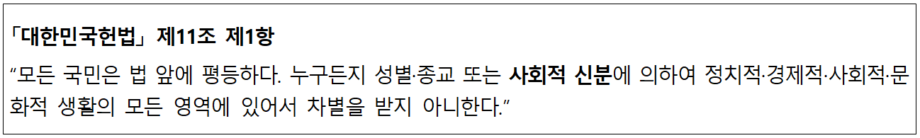 대한민국헌법 제11조 제1항은 모든 국민의 평등을 보장하고 있고, 특히 학력과 출신학교 또한 사회적 신분에 포함하여 차별받지 않을 것을 명시하고 있습니다. 또한 고용정책기본법 제7조 (취업기회의 균등한 보장)에는 합리적인 이유 없는 학력・출신학교에 대한 차별을 금지하고 있습니다.