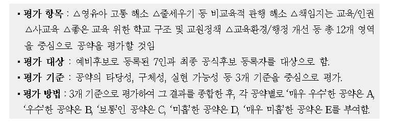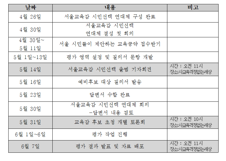 ▲ 주요 일정 : △5월 14일 출범 기자회견 △5월 16일 예비 후보 대상 질의서 발송, △ 5월 23일 후보 캠프 최종 답변서 접수 완료, △5월 31일 교육감 후보 개별 초청을 통한 공약 평가 토론회 개최, △6월 7일 최종 평가결과 발표 기자회견 등.