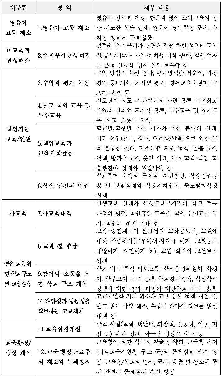 ▪평가 영역 : 영유아 고통 해소, 줄 세우기 관행 해결, 수업과 평가 혁신, 진로 직업 교육 및 특수교육, 학생 안전과 인권, 다양성과 평등성을 확보하는 고교체제, 교원의 질 향상, 참여와 소통을 위한 학교 구조 개혁, 교육행정관료주의 해소와 부패방지, 사교육대책, 책임교육과 교육기회균등, 교육환경 개선. 총 12개 영역