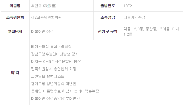 우리나라 학생들은 세계 최고 수준의 학습과로에 시달리고 있습니다. 성인의 과로사 기준인 주당 60시간을 넘어 주당 평균 70~80 시간의 학습과로에 내몰리고 있는 실정입니다. 이런 우리나라 아동·청소년의 현실은 유엔아동권리위원회뿐 아니라 유엔사회권위원회에서도 사교육 의존도를 줄이라고 권고를 내릴 만큼 매우 심각한 상황입니다. 정부, 지자체는 이러한 현실을 개선하고 아동·청소년을 과도한 학습노동으로부터 보호해야 할 의무를 가지고 있습니다. 그러나 이와는 반대되는 움직임이 경기도의회에서 나타나고 있음이 확인되었습니다. 8월 28일, 국제신문과 기호일보는 경기도의회 추민규 의원(더불어민주당, 제2교육위원회위원)이 현재 밤 10시로 제한된 경기지역 학원의 교습시간을 고등학생의 경우 11시 50분으로 1시간 50분 연장하는 내용의 조례개정안을 제출할 예정이라는 내용의 기사를 보도했습니다. 이번 연장안을 대표발의할 예정인 추민규 의원은 스스로를 교육전문가라 칭하며, 아이들의 건강한 학교문화를 만드는데 최선을 다하겠다고 밝힌 바 있습니다. 추민규 의원은 도의원 당선 이전 메가스터디, 대치동수시전문학원 등의 강사·원장 이력을 가지고 있는 인물입니다. 사교육 현장의 경험이 있는 만큼 그 현장에서 아이들이 겪는 어려움과 고통을 누구보다 이해하고 아파하며 그 현실을 바꿔가야 할 의무가 있는 것입니다. 그런데 밤 11시 50분으로 학원영업시간을 늘리는 개정안을 발의하는 것은 아동·청소년의 이익이 아니라 학원·교습소 등 학원업계 이해집단의 이익을 지나치게 반영하고 있는 행위라고 밖에 해석되지 않습니다. [그림1] 경기도의회 홈페이지 중 추민규 의원 프로필