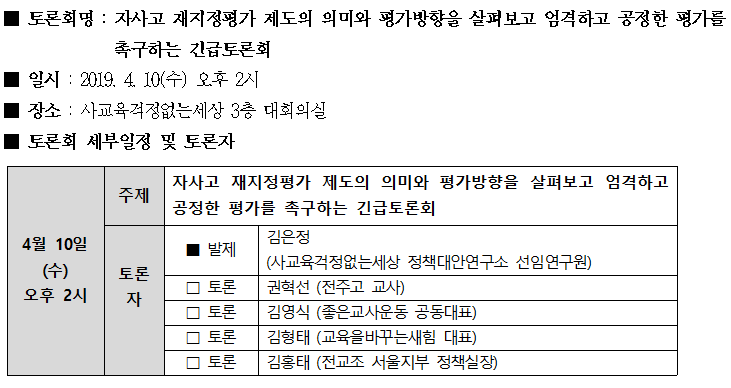 ■ 공정하고 엄격한 자사고 재지정평가를 촉구하는 긴급토론회 (2019.04.08)