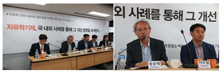 제1발제로 송순재 감리교신학대학 교수(삶을 위한 대학 이사장)가 덴마크 애프터스콜레의 사례를 통해 공교육과 대안교육이 어떻게 병렬적으로 공존할 수 있는지 그 필요성과 가능한 형태에 대해서 발제하였고, 제2발제는 서우철 의정부교육지원청 장학사(꿈이룸학교 교장)가 마을교육공동체인 의정부 꿈이룸학교 사례를 소개하면서 자유학기제와 같은 교육 혁신의 핵심은 결국 학생의 자발성, 즉 학생 중심의 교육 형태여야 함을 강조하였으며, 제3발제를 맡은 김현철 한국청소년정책연구원 선임연구위원이 아일랜드의 전환학년제와 일본의 청소년 직업체험활동을 통해 자유학기제 이후 일반학기가 가야 하는 방향성 및 자유학기제 동안 이루어지는 진로체험활동의 중점을 어디에 두어야 하는지에 관해 발표하였고, 마지막으로 본 단체 김은정 선임연구원이 종합토론을 통해 각 사례들이 자유학기제에 던지는 시사점과 개선방향을 모색하였습니다.