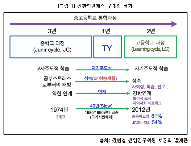 그러나 아일랜드 전환학년제는 [그림 1]에서 보듯이 중고등학교 교육과정이 통합적으로 운영되는 가운데 중학교 과정과 고등학교 과정 사이에 전환학년제가 위치하고 있지만, 우리나라 학제는 중고등학교가 분리되어 있고 중학교를 마치고 다시 고교 계열을 선택해야 하는 상황이기 때문에 중학교 과정에서 자유학기제의 기대효과는 전환학년제와는 차이가 있을 수밖에 없는 상황입니다.