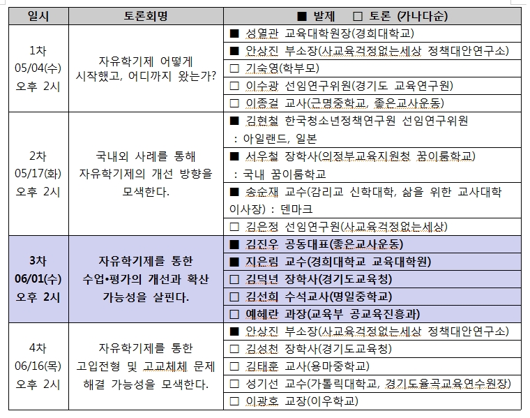 다음 3차 토론회는 6월 1일(수) 오후 2시 본 단체 3층에서, ‘자유학기제를 통한 수업‧평가의 개선과 확산 가능성을 살핀다.’ 는 주제로 열립니다. 학교 혁신의 가장 중요한 부분인 자유학기제를 통한 수업 및 평가의 개선에 관해 살펴보고자 합니다.