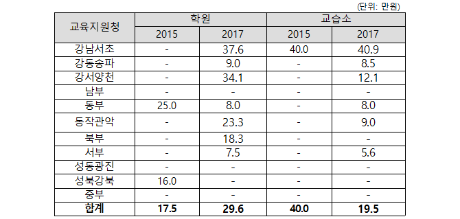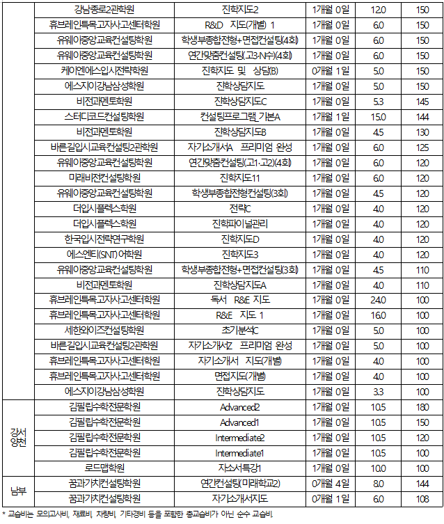 ■ 서울 11개 교육지원청 중 10개 교육지원청이 컨설팅 과목의 분당교습비 기준이 없어 교습비 증가에 대한 관리감독이 불가능한 상황임. 유일하게 기준이 존재하는 강남서초교육지원청의 경우 분당교습비가 5000원으로 한 시간 30만원, 월 600만원인 상품도 허용하고 있음.
