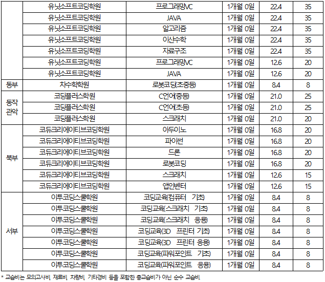 2017년 학원 및 교습소 현황 분석을 통해 코딩 과목이 많이 개설된 것을 확인했습니다. 코딩 과목을 개설한 학원은 2015년 2개였으나 2017년에는 16개로 700% 증가했으며, 교습소는 2015년 1개에서 2017년 9개로 800% 증가했습니다. 코딩 과목의 증가는 이보다 더 큽니다. 가장 많이 증가한 강남서초는 2015년에는 코딩 학원이 확인되지 않았으나 2017년에 10개 33과목이 신규 등록된 것으로 확인되었습니다. [그림5] 코딩과목 개설 현황 및 월평균 교습비  코딩 수업은 대체로 컴퓨터 학원에서 진행하지만 일부 코딩전문 학원이나 로봇, 블록을 가르치는 학원에서도 진행하며, 수학학원에서도 코딩 과목을 운영하는 것으로 확인되었습니다. 게다가 초중고 대상뿐 아니라 유아대상 코딩학원도 확인되었습니다. 월 교습비는 최대 60만원이며, 평균 29.6만원으로 수학과목의 월평균 교습비(29.1만원)보다 높았습니다. 가장 교습비가 비싼 지역은 강남서초지역으로 월평균 교습비는 37.6만원이었습니다. [표7] 컴퓨터 학원 평균 교습비  유‧초등 대상 코딩 개념 수업은 컴퓨터 없이 교재와 교구를 가지고도 가능해 학습지를 통한 엄마표, 방문 선생님 교육도 가능합니다. 때문에 학원 교습소 정보로 등록하지 않은 통신판매 등록 코딩 사교육이나 온라인 교육, 개인과외까지 포함한다면 코딩관련 사교육시장은 훨씬 클 것으로 생각됩니다. 교육부는 현재보다 더욱 철저한 관리감독을 해야 할 것입니다. [표8] 2017년도 코딩전문학원과 코딩과목을 개설한 컴퓨터 학원  이 같은 코딩 사교육의 증가는 새롭게 도입된 정부의 ‘소프트웨어 활성화교육’의 부작용으로 판단됩니다. 대표적인 예로 인프라가 구축되지도 않은 상황에서 학교 교육과정으로 대비할 수 없는 ‘정보 올림피아드 대회’ 수상실적이나 ‘소프트웨어 실기고서’등의 전형요소를 추가할 수 있는 소프트웨어 특기자전형을 대입제도로 신설한 것입니다. 이로 인해 사교육 시장은 들썩이기 시작했고 입시대비를 위한 학원뿐 아니라 ‘코딩유치원’까지 등장하는 해프닝이 벌어지고 있는 것입니다. 따라서 교육부는 소프트웨어 교육을 내실화해 별도의 사교육이 필요없다는 신호를 국민들에게 주어야 하며 공교육 정상화 방향에 역행하는 대입에서의 소프트웨어 특기자전형을 폐지해야 할 것입니다. 이상에서 살핀 것과 같이 서울시 학원 및 교습소 정보를 분석한 결과 논술, 입시컨설팅, 코딩 등 입시대비를 위한 사교육 상품의 개수와 가격이 모두 증가한 것을 확인할 수 있었습니다. 이는 고스란히 학생·학부모의 사교육비 고통으로 이어지게 될 것입니다. 이러한 문제를 해결하기 위해서 1차적으로는 교육청 및 해당 교육지원청이 교습 과목을 등록받고 교습비 기준을 조정하는 과정에서 관리감독을 철저히 해 교습비 상승을 막아야 할 것입니다. 2차적으로는 내년 8월에 발표할 2022학년도 대입제도 종합안에 공교육 정상화 및 입시 사교육 부담 해소를 위한 요소들을 반영해야 할 것입니다. 해당 요소로 비교과 활동 반영을 대폭 축소하는 학생부 종합전형 개선안, 논술전형의 축소 및 폐지, 교과 특기자전형의 폐지 등이 반드시 반영되어야 할 것입니다. 또한 이러한 요소들은 문재인 정부의 교육관련 국정 과제 방향이기도 합니다. 따라서 교육 당국은 위의 방안들을 반드시 정책으로 내놓아 국민과의 약속을 지키시기를 촉구합니다.