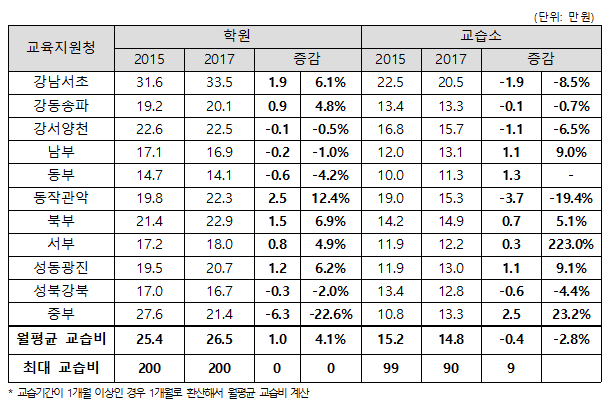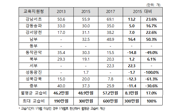이같은 교육 당국의 사교육비 경감에 대한 의지 부족이 2015년에 300만원이 최대였던 컨설팅 교습비가 2017년에 600만원으로 상승하게되는 빌미를 제공한 것으로 판단됩니다. 더군다나 ‘2016 초중고 사교육비조사’를 통해 나타난 1인당 월평균 사교육비는 25.6만원으로 조사 이래 최대치였습니다. 이런 상황에서 사교육기관의 교습비까지 오르는 상황이라면 ‘2017년 초중고 사교육비’는 역대 최대치를 또 다시 갱신할 것으로 예상됩니다. 따라서 교육 당국은 시급히 사교육비 경감을 위한 대책을 강구해야 할 것입니다. 그리고 그 시작은 사교육 시장의 가격을 조정하는 교습비 기준 마련부터 시작 되어야 할 것입니다.