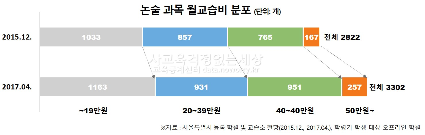 2017년 논술 과목의 월평균 교습비는 2015년 25.4만원에서 1만원 증가한 26.5만원이었습니다. 증가 폭이 가장 큰 지역은 동작관악지역으로 2015년 19.8만원에서 2017년 22.3만원으로 2.5만원이나 증가했습니다. 월평균 교습비가 가장 비싼 지역은 강남서초 지역으로 33.5만원이었으며 2015년 31.6만원에 비해 1.9만원(6.1%) 증가했습니다. 월평균 교습비가 감소한 지역도 일부 있었습니다. 가장 크게 감소한 중부 지역의 경우 일부 고액학원들이 교습시간을 줄이고 월 교습비를 낮춰 평균 교습비가 낮아진 것으로 확인되었습니다.(예: 종로학원, 단과논술 4000시간, 79만원 → 1040시간, 20만원) [표2] 논술과목 개설학원의 월평균 교습비  또한 논술교습비가 2015년 대비 고액화되고 있는 것을 확인할 수 있었습니다. 그림1은 학원에서 개설한 논술 과목의 월교습비 분포입니다. 가장 큰 비율로 증가한 구간은 월 교습비 50만원이상인 구간으로 2015년에 비해 53.9% 증가했습니다. 세부적으로 살펴보면 50만원~99만원인 논술과목은 156개에서 237개로, 100만원 이상인 논술과목은 11개에서 20개로 증가했습니다. 게다가 월교습비가 200만원인 상품까지 등록되어 있었습니다. 20만원 미만 구간도 12.6% 증가했습니다. 세부적으로 살펴보면 10만원 미만인 구간이 279~369로 32.3% 증가했습니다. 10만원 미만 구간은 교습 대상의 나이가 어린 초등학생이나 중학생 대상 수업이거나 교습시간이 상대적으로 10시간 미만인 수업들이었습니다. 즉 대입논술고사를 대비하기 위한 고액 프로그램의 증가세와 함께 입시 대비의 신호가 초중학생까지 내려가 이들을 대상으로 한 과목까지 증가하는 상황을 확인할 수 있었습니다. [그림1] 논술과목 월교습비 분포 변화  월평균 100만원 이상인 고액 논술 과목을 자세히 살펴보았습니다. 전부 강남서초지역에 몰려 있었으며, 대부분 국어, 수학, 영어 등 대입 논술고사를 대비하기 위한 프로그램이었습니다. [표3] 2017년도 월평균 100만원 이상 논술 교습과목  더불어 2013년부터 존재하던 강남서초 지역의 유아대상 논술학원이 여전히 존재하는 것도 확인 했습니다. 해당 학원 홈페이지에는 초등 1학년 국어 선행학습도 가능하다는 내용을 버젓이 광고해 ‘공교육 정상화 촉진 및 선행교육 규제에 관한 특별법(이하 선행교육 규제법)’을 위반하고 있었습니다. 이처럼 사교육기관이 법을 위반한 광고 및 선전을 하더라도 법에 처벌 조항이 없어 제대로 관리감독이 되지 않는 상황입니다. 더군다나 이러한 사교육기관의 광고는 유아의 한글 선행학습이 필요없도록 한글교육을 국가가 책임지겠다는 취지에서 올해부터 초등학교 1학년에 도입된 정부의 한글책임교육 정책을 무색하게 하고 있습니다. 따라서 교육부는 공교육 내실화에 대해 국민의 신뢰를 쌓기 위한 차원에서라도 이같은 사교육기관의 선행상품 광고에 대해 관리감독을 철저히 해야 할 것입니다. 나아가서는 사교육기관의 선행교육 상품에 대해서도 실효성 있는 규제를 할 수 있도록 선행교육 규제법을 개정해야 합니다. [그림2] 유아 대상 논술과목을 운영하는 학원 사례