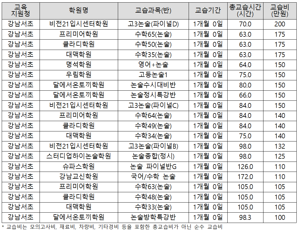 강남서초 지역에 개설된 컨설팅 과목의 분당교습비 기준인 5000원은 2013년 교습비조정 위원회에서 승인되어 2013년 12월 1일부터 시행되었습니다. 2013년 당시에도 과도한 사교육비로 인한 고통의 경감, 즉 사교육 경감대책이 교육 관련 정부의 정책 방향이었습니다. 그런데 현재 물가를 고려하더라도 지나치게 비싼 분당교습비 기준을 해당 교육지원청이 승인해 주었다는 것은 사교육비 경감에 대한 의지가 없는 것으로 이해됩니다.