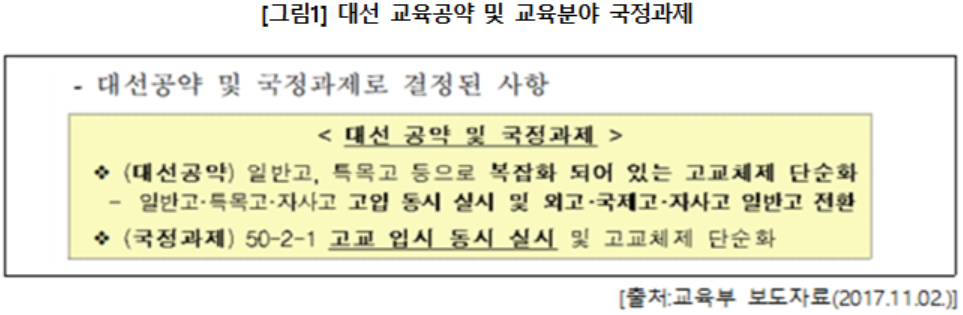 또한 자사고·외고·국제고의 일반고 전환은 대다수 국민이 지지하는 문재인 대통령의 주요 교육공약이며 국정과제로도 이미 채택된 사안인데도 불구하고, 이번 교육부의 발표는 고교체제 개편을 시작하기도 전에 정부의 공약 이행의 의지가 약화되었거나 이에 대한 책임을 시·도교육감들에게 넘기는 것으로밖에 이해되지 않습니다. 고교 입시 동시 실시와 고교체제 단순화는 모두 국정과제인데, 우수학생 선점 효과 해소를 장담할 수 없는 ‘고교 입시 동시 실시’에 대해서는 교육부가 시행령 개정을 통해 진행하면서, 이보다 훨씬 더 복잡하고도 어려운 과제인 ‘고교체제 단순화’ 와 관련된 주요 권한은 교육부의 동의권 폐지 결정을 통해 교육감들에게 그 책임을 떠넘기고 있는 것입니다.