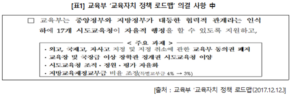 ▲ 교육부는 지난 12월 12일 교육자치정책협의회 의결을 통해, 앞으로는 자사고·외고·국제고의 지정 및 취소 시에 각 시·도교육청이 교육부의 동의를 얻지 않아도 되도록 하는 안을 발표함.