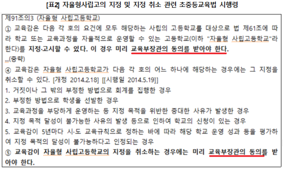 비록 교육부의 동의권 폐지 방침이 교육부의 권한을 배분하고 학교 민주주의 실현을 위한 자율성 부여를 명분으로 한다고 하지만, 「자사고·외고·국제고의 일반고 전환」이라는 중요한 대통령 공약을 이행해가는 예민한 시기에 사실상의 권한을 가진 교육부가 자사고 등의 지정 및 지정 취소에 관한 동의권을 폐지하고 시·도교육감에게만 권한을 부여하겠다는 것은 매우 유감스러운 일입니다.