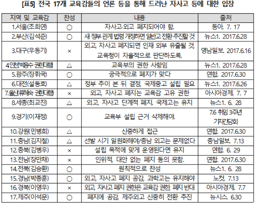정리하면 자사고 등의 일반고 전환에 적극적으로 찬성한 교육감이 7명, 명확한 반대 의견이 5명, 유보 의견이 5명이었습니다. 소위 보수 교육감으로 분류된 대구, 울산, 경북 교육감 외에 진보 교육감으로 알려진 충북, 전남 교육감의 경우에도 반대 의견을 표명했습니다. 그리고 세종 교육감은 국제중·고의 경우 설립 취지에 맞게 운영되므로 폐지하는 것을 반대했고, 충남 교육감은 선발 시기를 일원화하는 것만 동의하고 지역 내의 외고는 유지한다는 방침을 밝혔으며, 대전과 강원 교육감은 유보 의견을 표명했습니다. 소위 진보 교육감이라 할지라도 지역의 학교 특성에 따라 일괄 폐지에는 반대하거나 유보하는 입장을 가진 것으로 확인되었습니다. △“신중하게 접근해야 한다.”며 유보적 입장을 취하거나, △자사고·외고의 폐지에는 찬성하나 국제고 폐지에는 반대하거나, △서울과 같이 자사고·외고의 큰 문제는 없으니 교육청 관내 해당학교는 폐지할 필요가 없다고 하거나, 또 이번 교육부의 발표대로 △지정·취소권이 교육감에 전적으로 주어지면 자율적으로 결정할 일이라고 하는 등의 이유를 들어 미온적 태도를 보이고 있습니다.