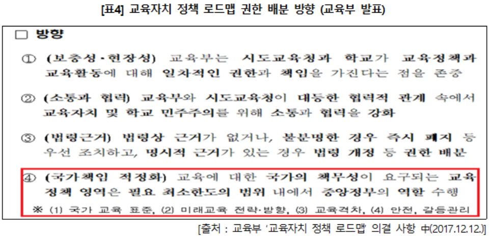 교육부는 지난 12일 이 사항을 의결한 ‘교육자치 정책 로드맵’에서 교육정책에서 국가의 책무성이 요구되는 영역은 필요 최소한도의 범위 안에서 중앙정부의 역할을 수행할 것이라고 그 방향을 밝혔습니다. 자사고·외고·국제고와 관련된 사안은 바로 그 영역입니다. 국가의 책무성을 보여야 하는 미래교육 방향과 관련된 부분이고, 주요한 학교제도의 정비이며, 교육격차에 영향을 미치는 교육정책으로써 중앙 정부의 분명한 역할 수행이 요구되는 영역입니다. 자사고 등의 일반고 전환과 관련된 사항을 단순히 시·도교육감에게 권한을 배분하는 사항 중 하나로 보고 정리해서는 안 될 것입니다.