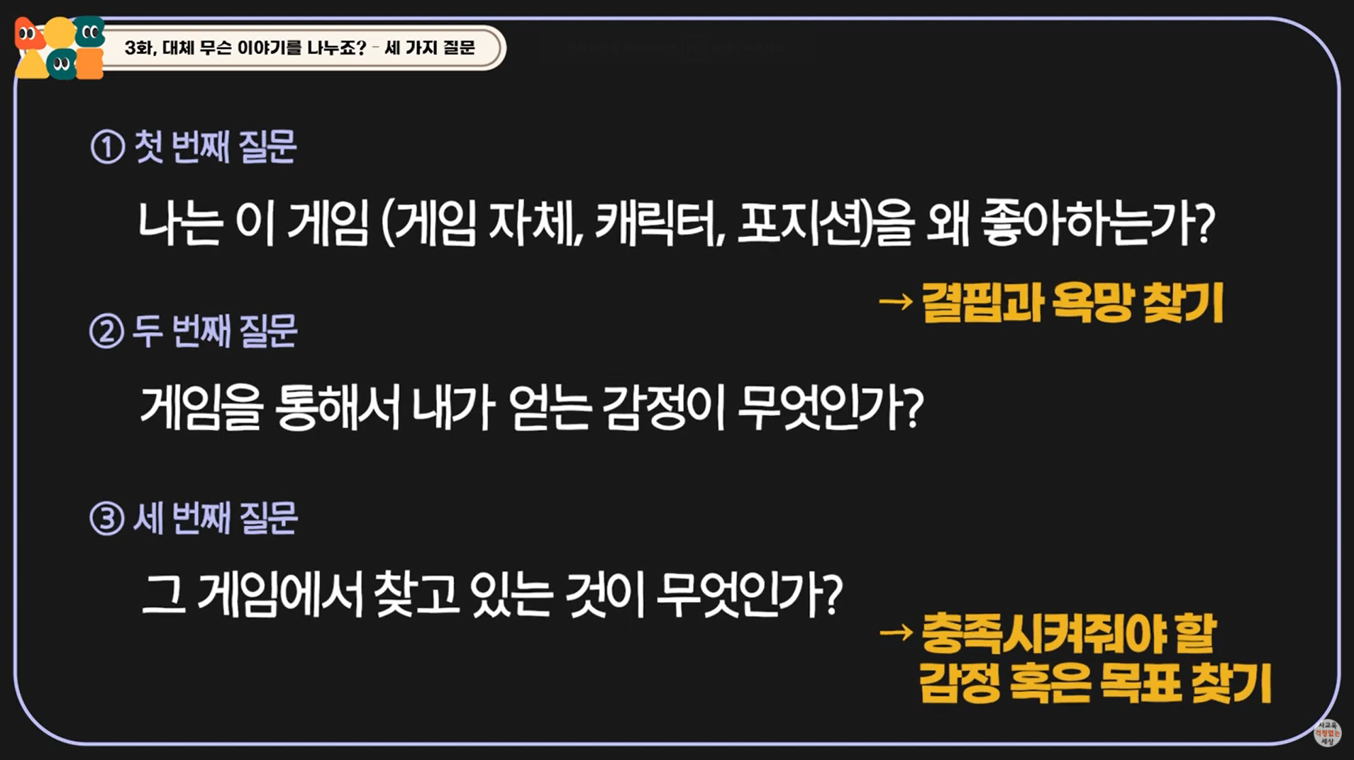 아이들의 ‘미디어와 게임 노출’! 게임을 많이 하는 것을 넘어 일상생활까지 망치는 중독으로 이어질까봐 고민이 많이 되시지요? 지난 2화에서 아이들에게 온라인 세계는 또 하나의 세계라는 이야기까지 들어봤어요. 3화에서는 ‘게임 중독을 멈출 수 있었던 세 가지 질문’을 통해 아이의 결핍과 욕구를 찾는 방법을 알려드립니다.