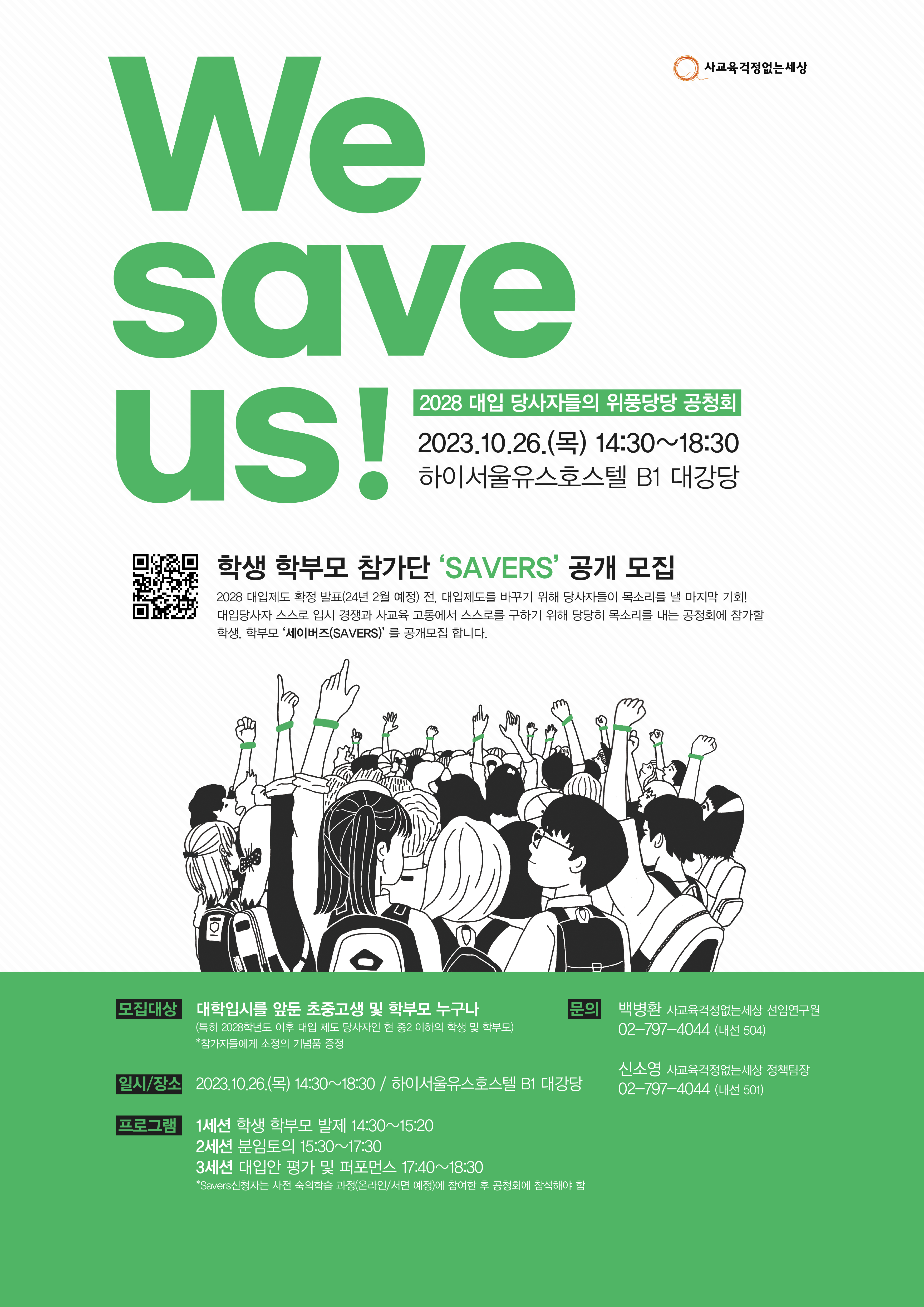 사교육걱정없는세상은 이러한 문제의식을 바탕으로 학생과 학부모가 주축으로 참여하는 ‘당사자의, 당사자에 의한, 당사자를 위한’ 공청회를 개최할 예정입니다. ‘2028 입사 당사자들의 위풍당당 공청회’는 대입제도 개편에 대해 당사자들이 논의하는 공론장입니다. 학생·학부모 참여단인 세이버즈(SAVERS) 100인이 모여 입시에 대한 문제를 토로하고 바람직한 대입제도에 대한 방향을 제안하게 됩니다. 10월 26일(목) 하이서울유스호스텔 B1 다이아몬드홀에서 개최될 예정입니다. 본 공청회는 교육 문제나 대입제도에 관심 있는 학생·학부모라면 누구나 참여 가능합니다.
