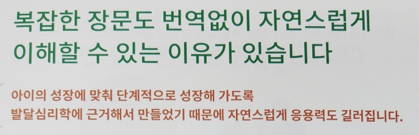「“생활동화 안에 초등 교과서에서 다루는 거의 수준이 다 들어가 있어요. ...(학습지를 보여줌) 선생님 방문도 있고 센터로 하는 것도 있어요. 센터로 와서 그룹으로 하는 건 한 달에 12만 8천원 이 책을 가지고 매주 하나씩 주제에 맞게 발화하는 아웃풋 수업을 해요. 내가 주인공이 되어 일주일에 한 번씩 놀이를 하는 거예요. 그러니까 티칭이 아니라 액팅이라고 하고요.”」