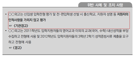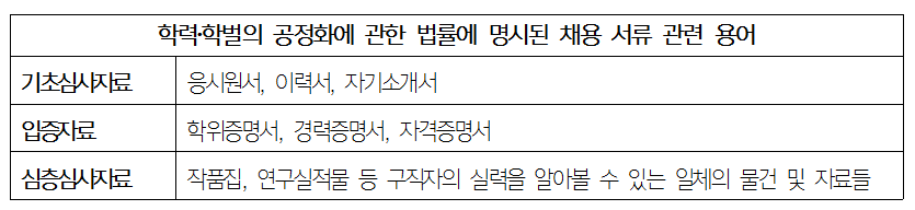 [4] 입사지원서 외에도 기초심사자료인 응시원서, 이력서나 자기소개서, 또 심층심사자료에도 ‘학력’과 ‘출신학교’ 관련 내용이 담기지 않도록 해야 함.