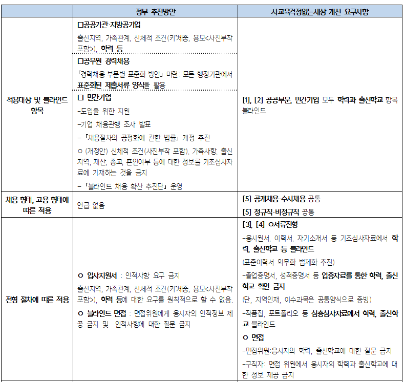 [표1] 정부 블라인드 추진방안과 사교육걱정의 개선 요구사항 비교표