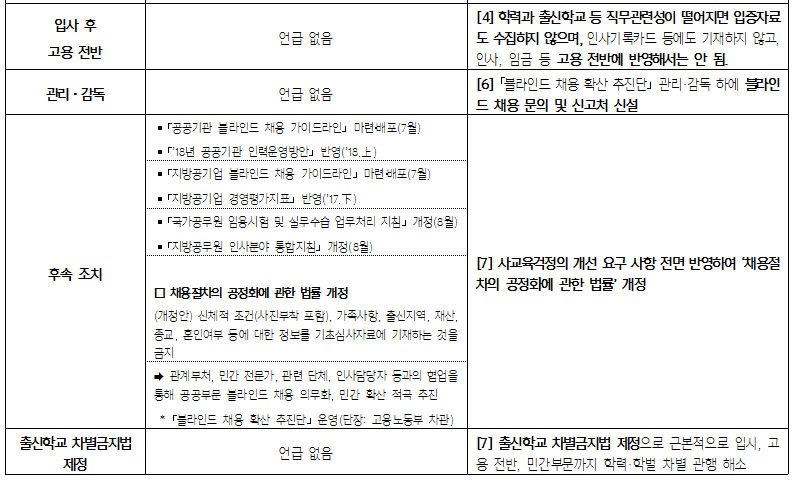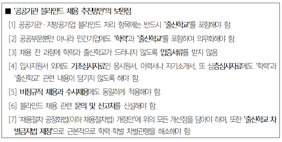 추진방안의 '1. 공공기관‧지방공기업에 대한 주요내용’을 보면, 블라인드 처리 항목이 출신지역, 가족관계, 신체적 조건(키・체중, 용모<사진부착 포함>), 학력으로만 명시되어 있어서 출신학교가 빠져 있습니다. 학력과 별도로 ‘출신학교’ 항목을 넣어야 합니다. 1993년 12월 27일 고용정책 기본법을 제정할 때 “(취업기회의 균등한 보장) 사업주는 근로자를 모집·채용함에 있어서 성별, 신앙, 사회적 신분, 출신지역 또는 출신학교 등을 이유로 차별을 하여서는 아니되며, 균등한 취업기회를 보장하여야 한다.”라고 명시하였습니다. 그리고 2014년 1월 21일 "출신학교"를 "학력, 출신학교"로 나눠 더 폭넓게 취업기회를 균등하게 보장하고자 하였습니다. 이렇듯 고용정책기본법은 1993년 제정 당시에 출신학교 등을 이유로 한 차별을 금지했을 뿐만 아니라, 2014년에는 더욱 전향적으로 학력을 명시하여 학력과 출신학교에 따른 채용상의 차별을 금지하고 있습니다.